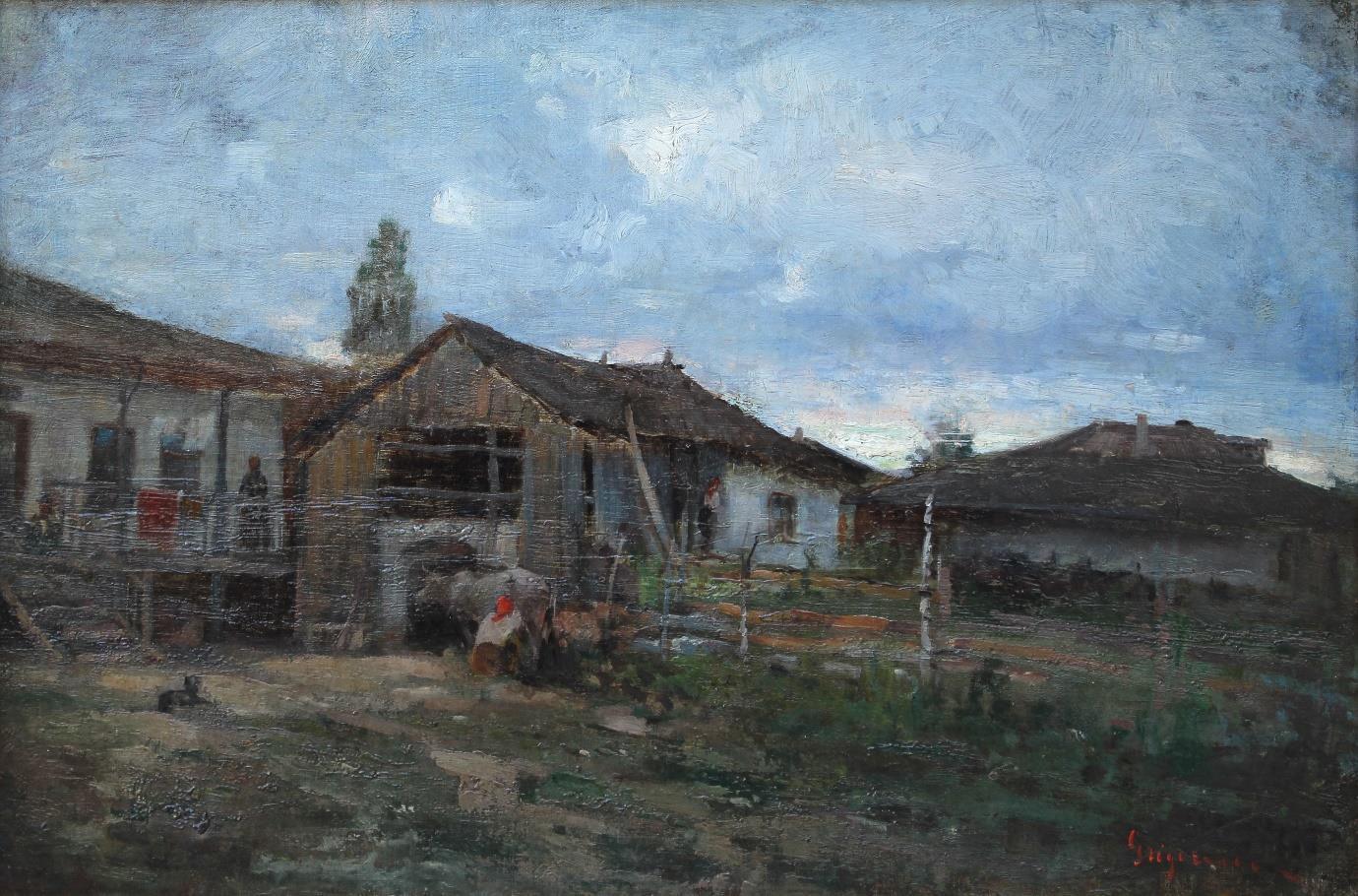 Artistul înregistrează datele imaginii așa cum realitatea oarecare a acestei gospodării i le oferă ochilor, fără să caute ori să întâlnească armonii compoziționale. Linia în zig-zag a acoperișurilor celor trei foarte modeste case desparte, decupând net, zona apăsătoare a materialității de cea oferită de cerul de după apus. Momentul de pace de la lăsarea serii cu geana de sclipire ultimă a soarelui scufundat, aduce unda poetică a amurgurilor pe care Grigorescu le-a îndrăgit mereu. În ea se înscriu cele trei tăcute prezențe umane, ce țin companie singurătății artistului. Către centrul imaginii, discreta scenă aproape inobservabilă, dar perfect identificabilă ca subiect – mulsul vacii în ritualul de seară, de către femeia cu batic roșu – devine accentul de viață ce redă semnificație întregii lucrări.