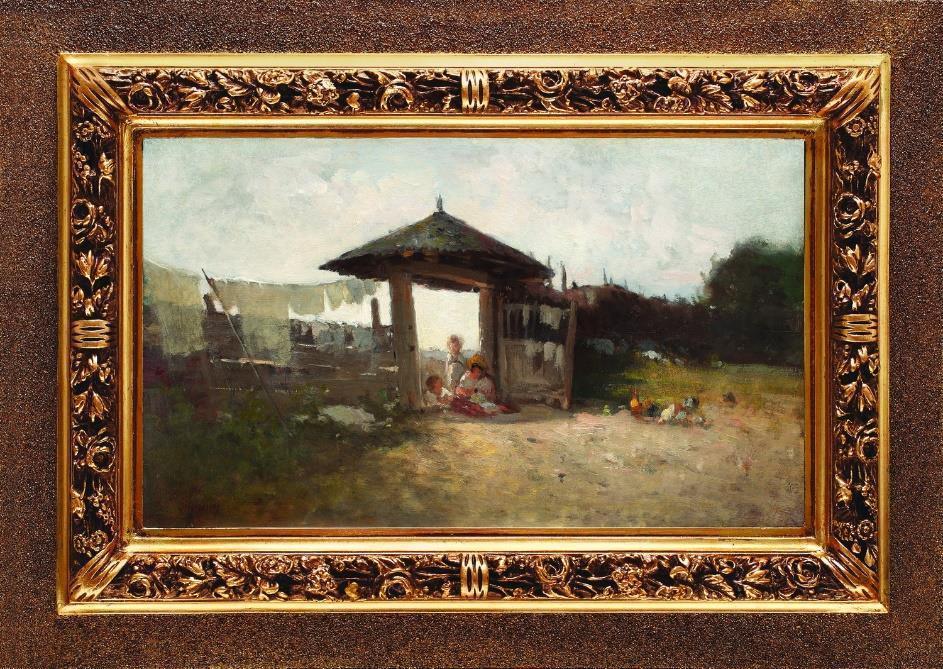 Caracterul frust, neidealizat al subiectului rural – o  poartă de lemn, un gard dărăpănat și un grup de personaje (mamă cu copii) așezați pe jos, în prag – ne sugerează perioada în care lucrarea a fost pictată, când artistul nu se îndepărtase încă de opțiunea pentru realism, pe care și-a afirmat-o în ambianța Școlii franceze. Datarea în anii 1870 este susținută și de grafia mai mare a semnăturii, diferențiată de cea pe cea o cunoaștem mai bine, măruntă și calmă înspre final.