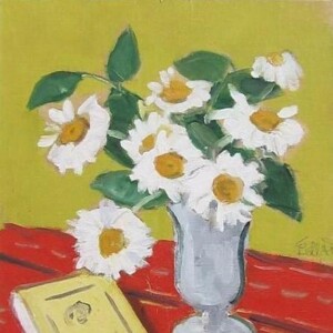 În centrul acestei naturi moarte tronează un buchet floral în nuanțe puternice, așezat într-un vas alb-grizat, decorat cu motive vegetale. Prețiozitatea paletei cromatice captează imediat privirea: albul are corespondențe în zonele iluminate ale vasului, pe planșeta măsuței, cât și pe peretele din fundal; roșul vibrant al gladiolelor, însoțite de alte flori în tonuri luminoase de galben, albastru, liliachiu dar și grena, în contrast cu verdele închis al frunzelor; nuanțele elegante și mate de verde ale perdelei și ciorchinelui de strugure. Ocrul cartonului devine participant activ al coloritului, în special către fundal, la nivelul peretelui, precum și în jumătatea inferioară a picturii.