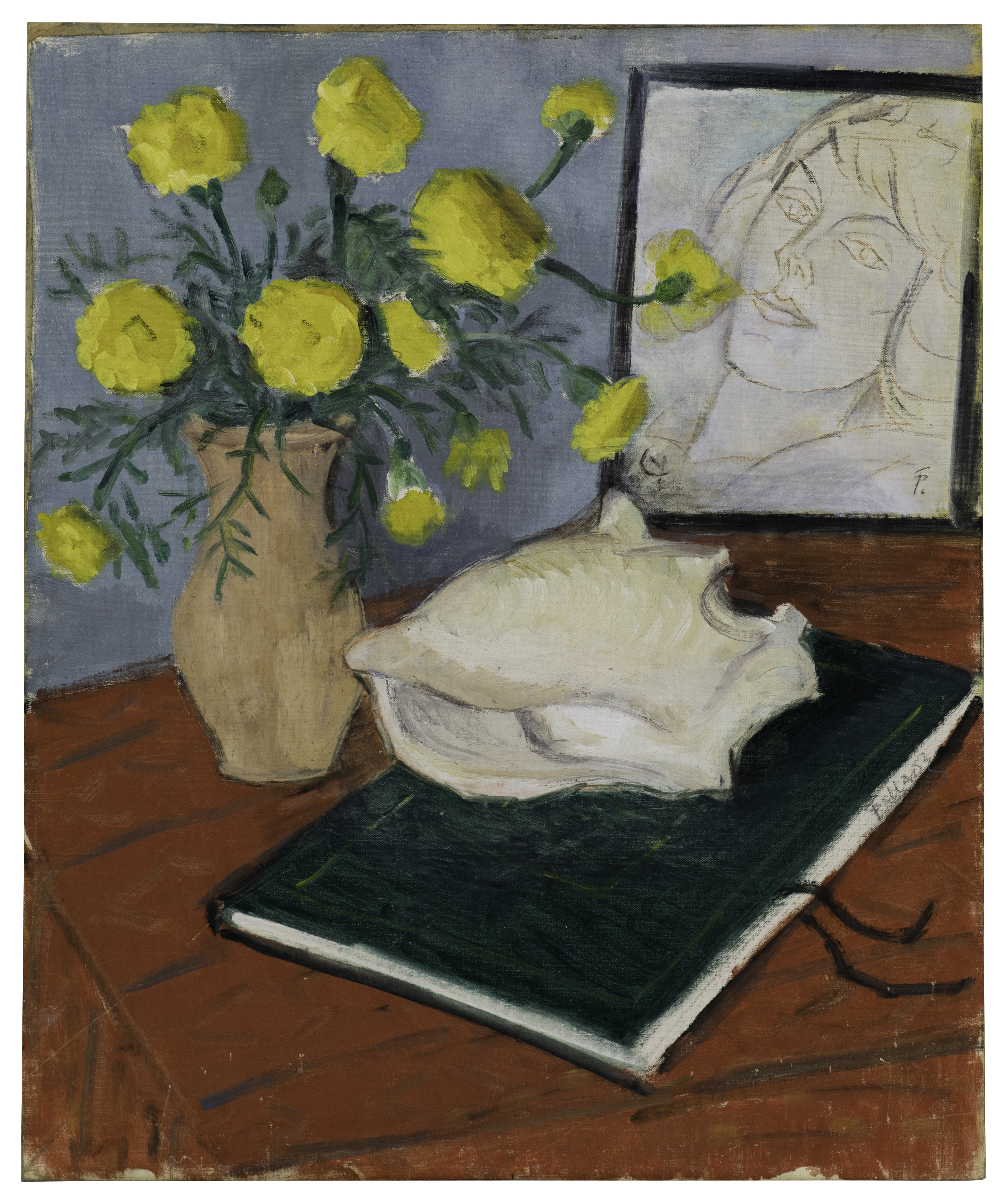 Lucrarea nu este însă una melancolică, o reprezentare a disperării sau chiar a dorului de nesuportat, dimpotrivă, este felul demn, palladian, de a atinge acea râvnită treaptă care accede spre absolut, armonie și eliberare. Scoica, așezată central, pe mapa din care a fost probabil scos desenul cu portretul iubitei, este un simbol clar al feminității și poate avea rol de souvenir; în schimb, literatul Lucian Blaga citește în prezența motivului o metaforă a interiorizării7. Carcasei dure cu protuberanțe ascuțite a scoicii i se alătură buchetul cu flori galbene care par să prindă viață, închinându-se omagial Yvonnei. Culorile sunt mate și totodată puternice, unele așezate pe suprafețe extinse: roșul feței de masă, albastrul deschis al peretelui, verdele de smarald al carnetului sau galbenul florilor; mai delicate sunt nuanțele de crem sau bej la nivelul scoicii și desenului.